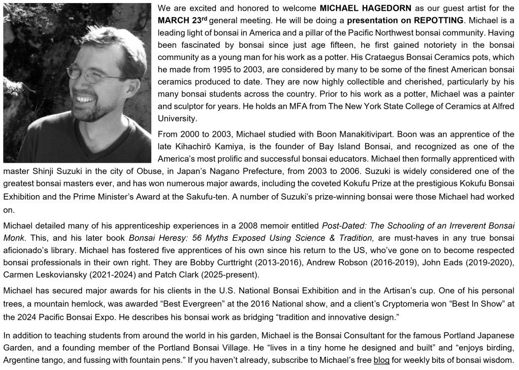 We are excited and honored to welcome Michael Hagedorn as our guest artist for the March general meeting. He will be doing a presentation on repotting. Michael is a leading light of bonsai in America and a pillar of the Pacific Northwest bonsai community. Having been fascinated by bonsai since just age fifteen, he first gained notoriety in the bonsai community as a young man for his work as a potter. His Crataegus Bonsai Ceramics pots, which he made from 1995 to 2003, are considered by many to be some of the finest American bonsai ceramics produced to date. They are now highly collectible and cherished, particularly by his many bonsai students across the country. Prior to his work as a potter, Michael was a painter and sculptor for years. He holds an MFA from The New York State College of Ceramics at Alfred University.